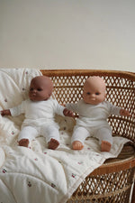 Our Alfie doll is made in vinyl with organic cotton fabric and recycled polyester filling, and features lifelike eyes full of depth and detail. Alfie comes dressed in a two-piece set with pointelle pants and blouse, made in 100% organic cotton. The outfit is easy for the child to take on and off, perfect for independent play.