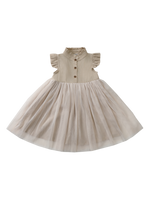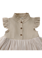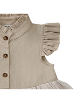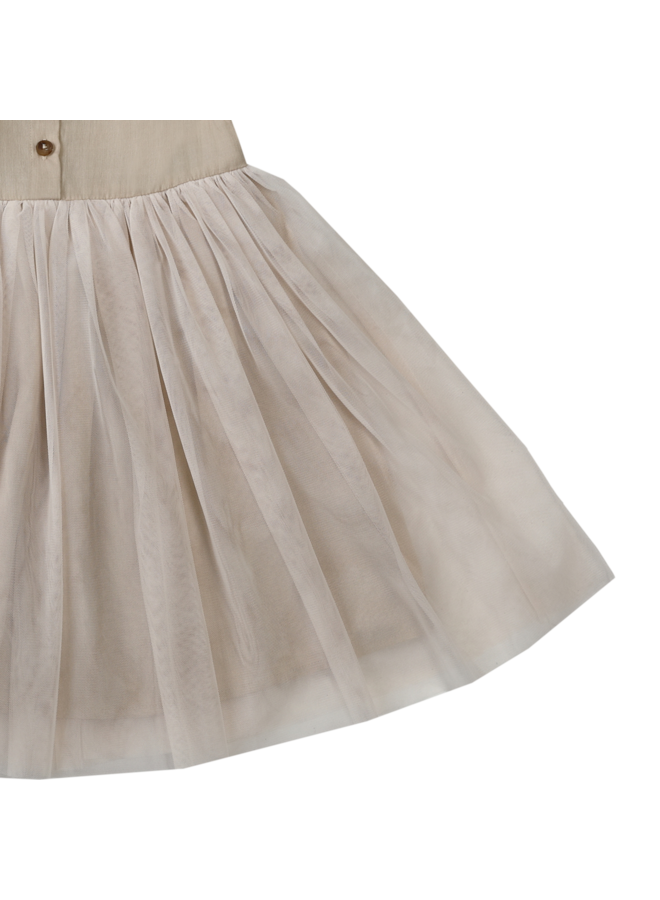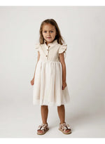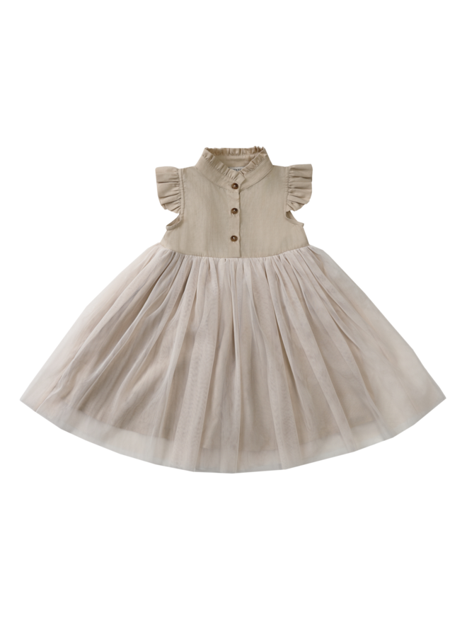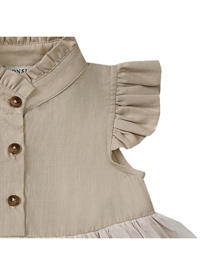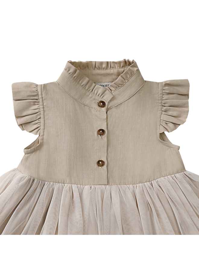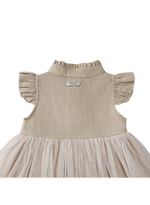 Delicate soft-sand dress from Donsje Amsterdam, crafted from breathable cotton with airy tulle accents for a light, dreamy look. Featuring a charming ruffled collar and flutter sleeves, it’s perfect for everyday wear or special celebrations with a whimsical, princess-like feel.
