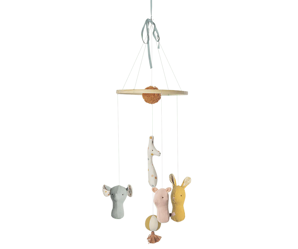 Lullaby friends is a collection of beautiful baby items. This mobile is perfect for the baby to look at from the bed or the nursery table. The animals are made in soft fabrics with unique prints and come in a beautiful gift box.