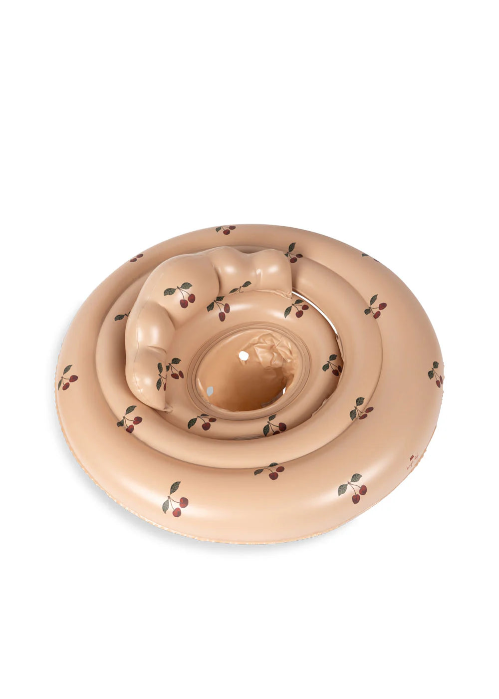 Inflatable baby swim ring with an integrated baby seat and back support and holes for your baby’s legs.