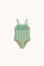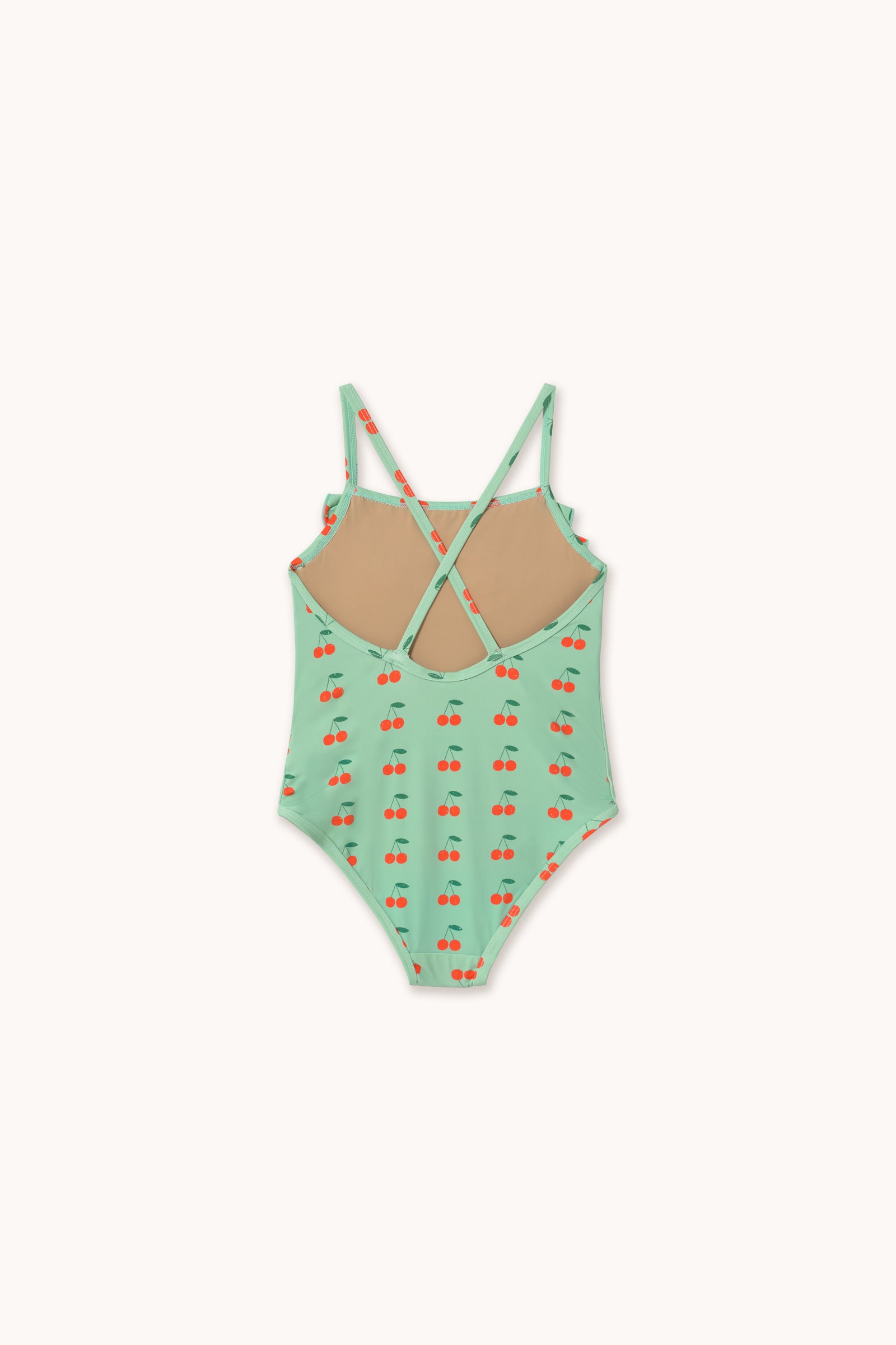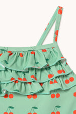 Add a cheerful touch to summer with this strappy swimsuit, crafted from a soft, stretchy fabric for maximum comfort. Featuring our charming Cherries print on an emerald base and delicate ruffles on the front, it perfectly combines style and fun for sunny days.