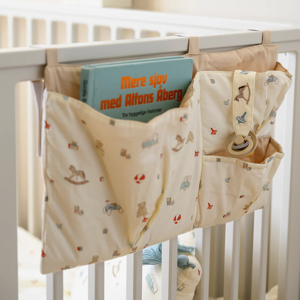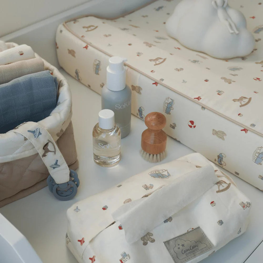 Made from GOTS-certified organic cotton, this charming holder features delicate embroidery of iconic toys of yesterday.