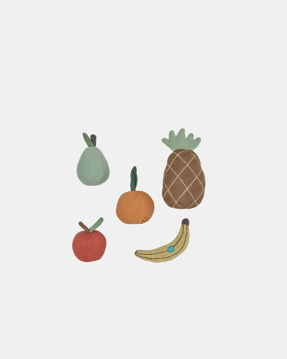 The Yummy Mini Fruits set features a delightful collection of an apple, banana, pear, orange, and pineapple. Made from 100% cotton with 100% polyester filling, these soft and playful fruits provide endless fun for imaginative play. Perfectly packaged in a charming fabric bag, this set adds a touch of fruity magic to your child's playtime adventures.