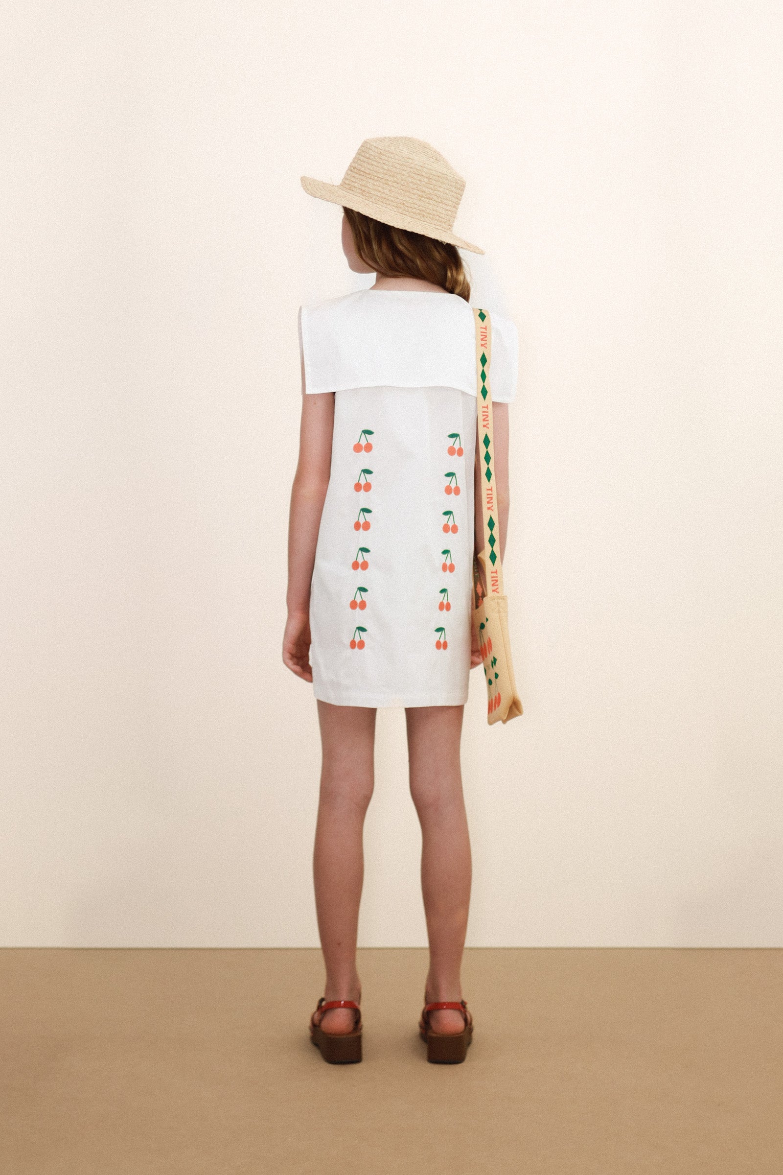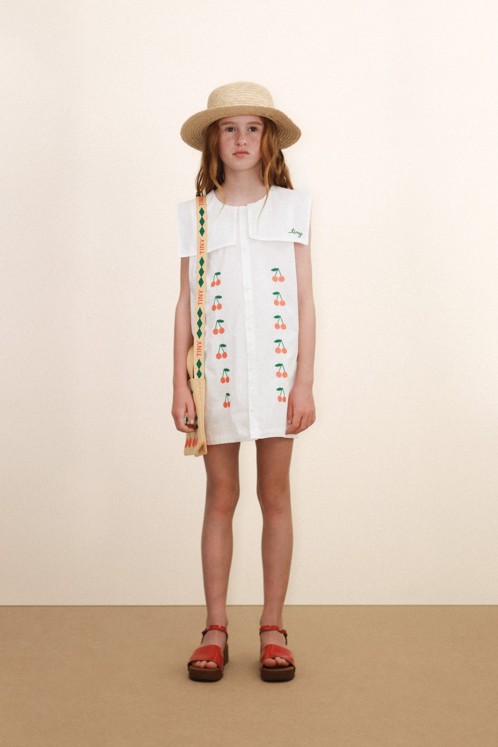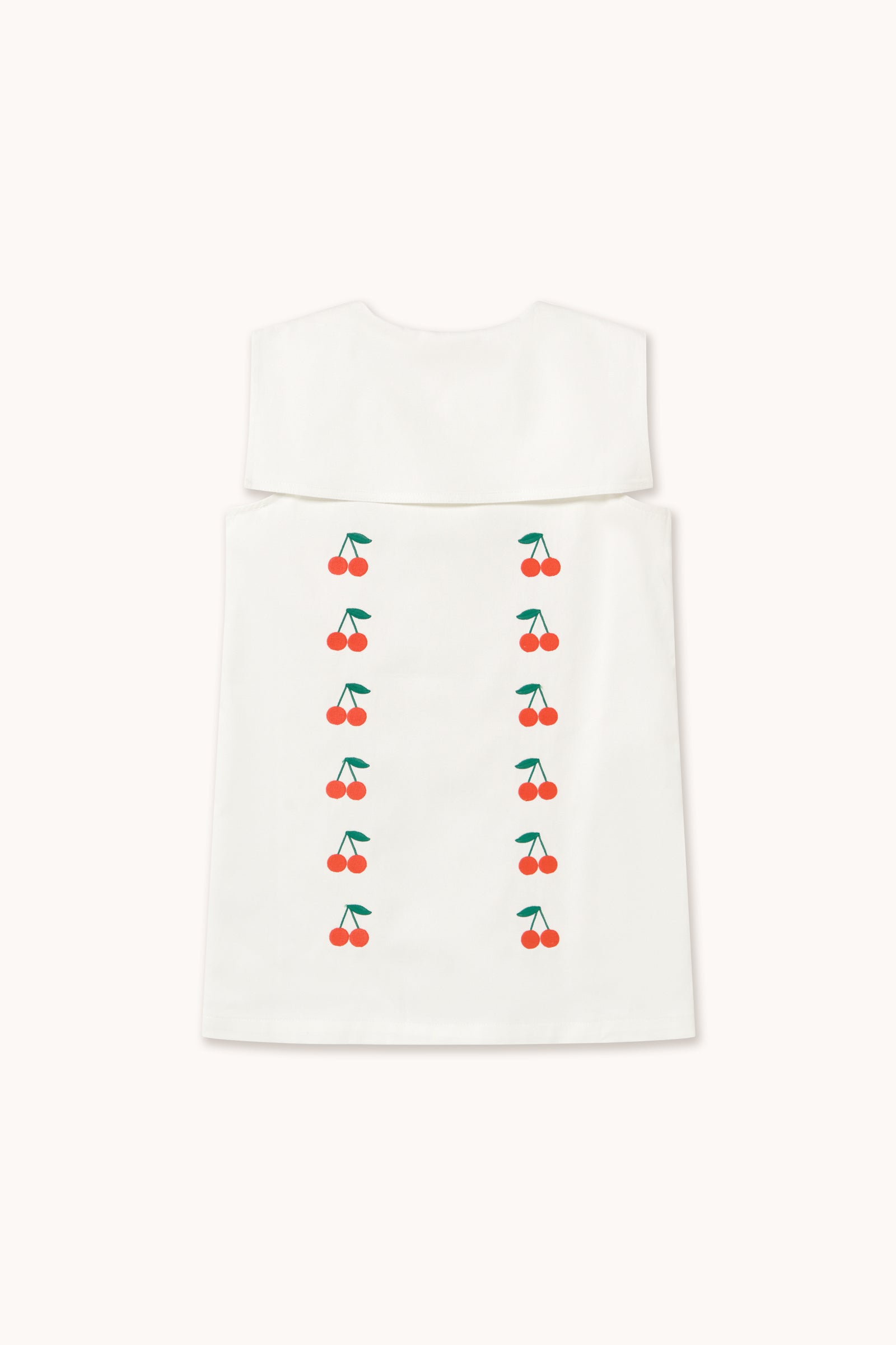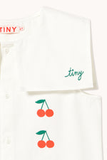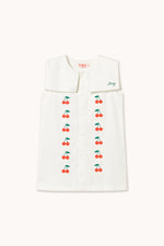 Ši trumpa minkšto vidutinio storio tvilo suknelė su balkšvu pagrindu ir siuvinėta „Mini Cherries“ raštu derina klasikinį dizainą su subtiliu prisilietimu. Ji turi priekyje sagomis užsegamą susegamą sruogą iki pat apačios ir kvadratinę jūreivio apykaklę, kuri suteikia elegantišką ir žavingą įvaizdį, puikiai tinkančią bet kokiai progai.