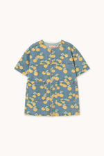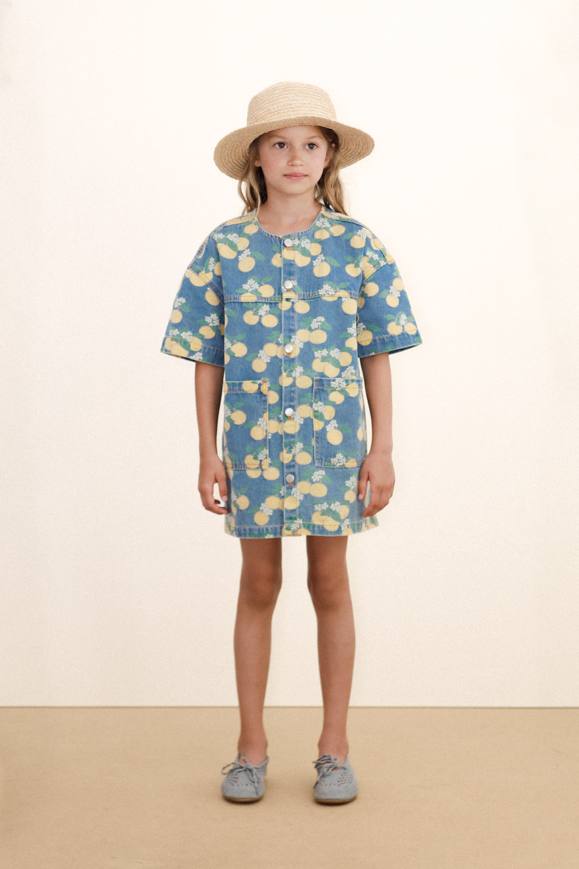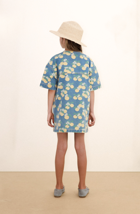 Ši trumpa džinsinė suknelė su apelsinų raštu derina gaivumą ir žaismingumą universaliame drabužyje. Trumpos rankovės, apvali iškirptė, priekinės kišenės ir sagų užsegimas priekyje – patogus ir stilingas derinys. Puikiai tinka mėgautis diena, suteikiant visišką judėjimo laisvę ir džiaugsmingą atspalvį.