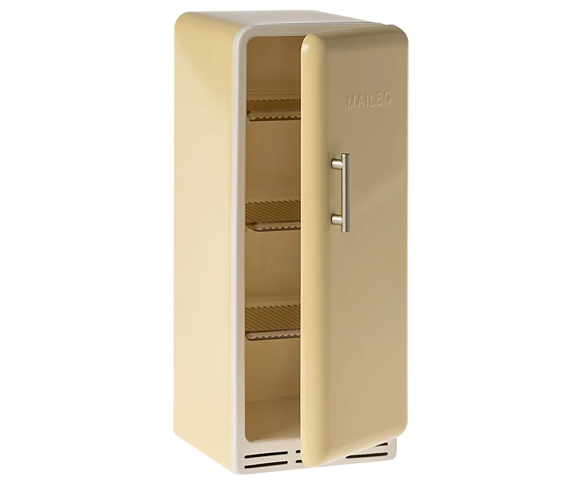 Maileg Miniature Fridge – Yellow – tai žaismingas ir retro stiliaus mini šaldytuvas, sukurtas Maileg pelytėms ir zuikiams. Jo šilta geltona spalva suteikia interjerui žavesio ir išskirtinumo, o funkcionalus dizainas leidžia laikyti mažus priedus ar „maisto“ aksesuarus.