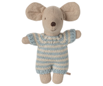 Mažas peliukas minkštu dryžuotu megztu kostiumėliu. Jis valandų valandas miega savo mažame dygsniuotame nešioklėje.