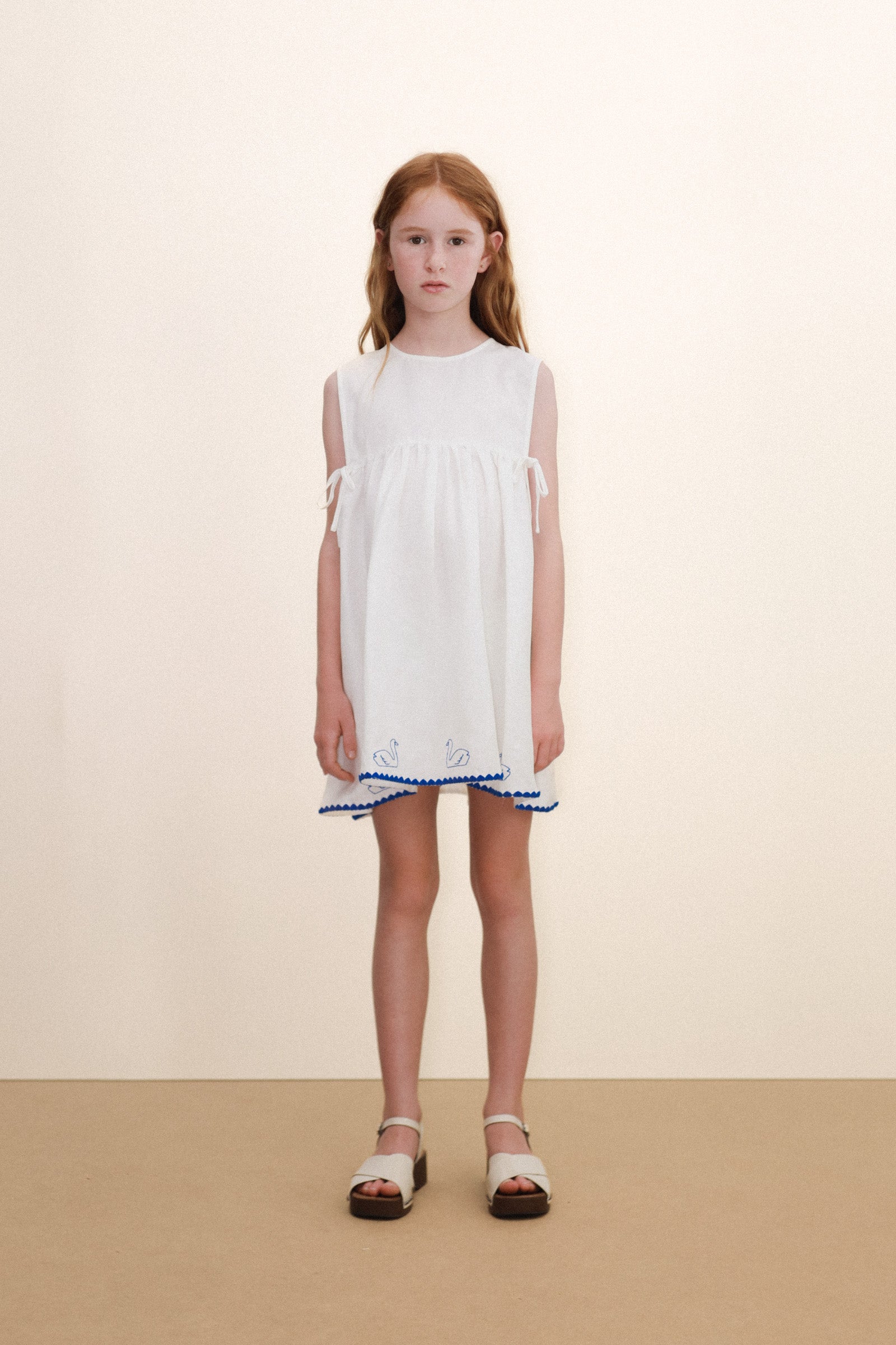 Ši siuvinėta „Swans“ suknelė – tobulas stiliaus ir patogumo derinys. Pagaminta iš minkšto, kvėpuojančio medvilnės mišinio, ji užtikrina gaivumą ir komfortą visą dieną. Apvali iškirptė ir sagų užsegimas gale leidžia lengvai apsivilkti, o šoniniai raišteliai leidžia reguliuoti klosčių aukštį, suteikiant unikalų stiliaus akcentą. Be rankovių, idealiai tinkanti šiltesnėms dienoms, ši suknelė sujungia eleganciją ir funkcionalumą viename drabužyje.