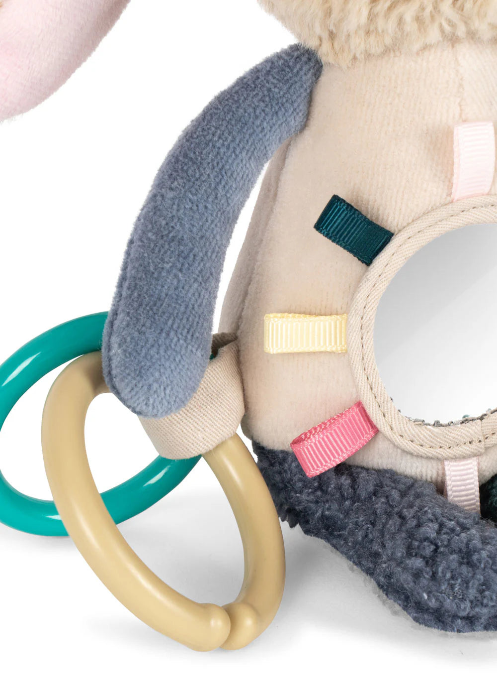 Peluche is designed with different textures that stimulate the senses, a rattle function, a mirror, and easy-grab handles.