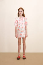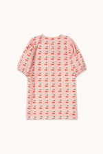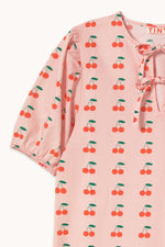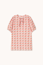 Ši trumpa suknelė su vyšnių raštu ant pastelinės rožinės spalvos pagrindo derina gaivumą ir stilių žavingame, universaliame dizaine. Trumpos pūstos rankovės, apvali iškirptė ir priekinė anga su raišteliais užtikrina patogų kirpimą ir atsipalaidavusį įvaizdį. Puikiai tinka saulėtoms dienoms ir žavingoms neformalioms progoms.