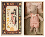 Klasikinė Maileg peliukė, pasiruošusi valandoms žaidimų ir saldžiam miegui savo degtukų dėžutėje. Drabužėliai ir patalynė pasiūti iš minkštų, spalvingų audinių su unikaliais raštais, o peliukės rankytėse įdėti magnetai, kad galėtų laikyti aksesuarus.