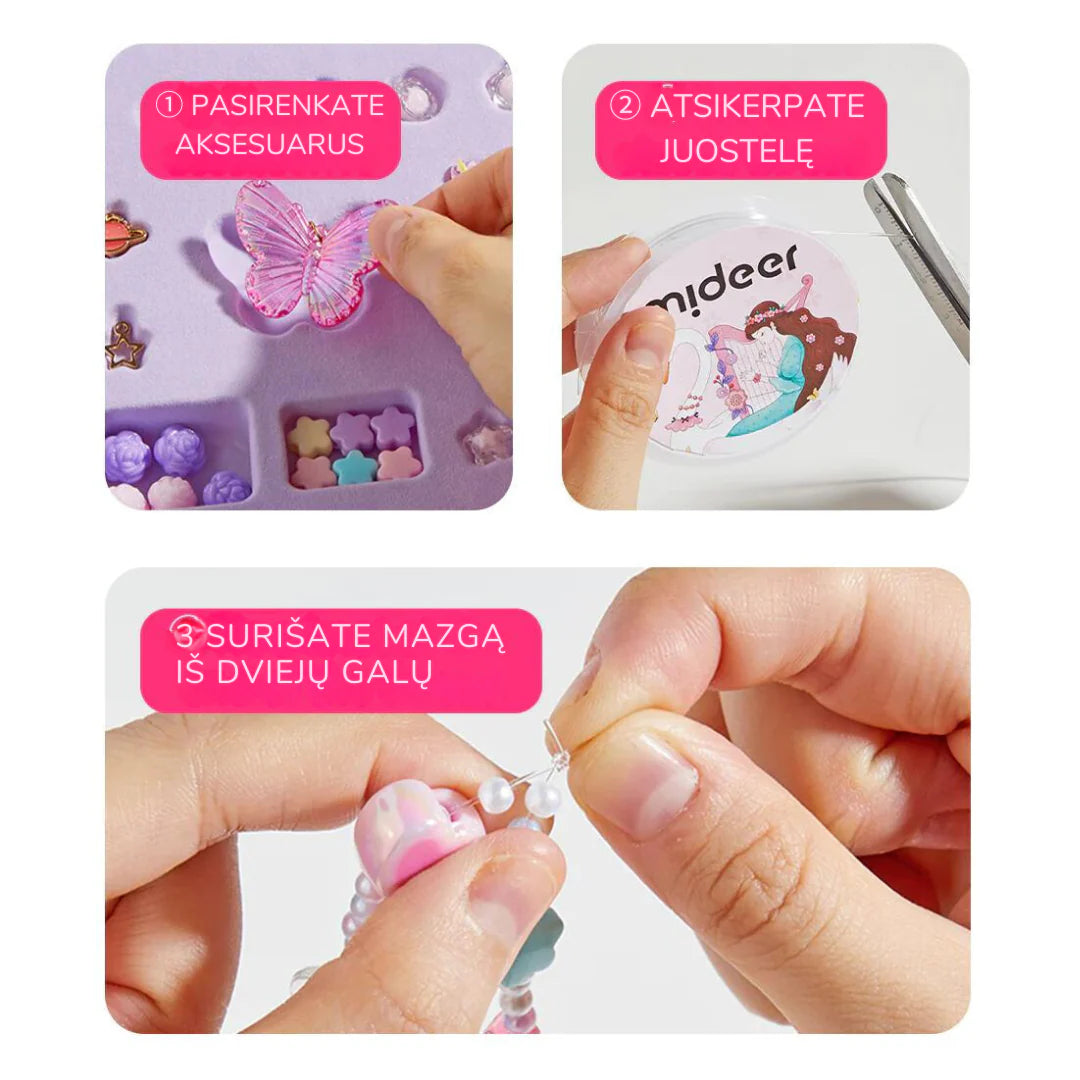 Šis mideer papuošalų kūrimo rinkinys, leidžia vaikams kurti unikalius mados aksesuarus, tokius kaip vėriniai, apyrankės, žiedai ir auskarai. Vaikai gali lengvai sukurti savo unikalius juvelyrinius dirbinius atlikdami tris paprastus veiksmus. Pirmiausia, jie pasirenka mėgstamiausius karoliukus ir pakabukus iš rinkinio. Tada jie atsikerpa reikiamo ilgio rinkinyje esančią elastingą, skaidrią virvelę.Galiausiai, jie suveria karoliukus pasirinkta tvarka ir tvirtai suriša mazgą virvelės gale, kad viskas liktų vietoje. Tai puikus būdas ugdyti kūrybiškumą, tobulinti smulkiąją motoriką ir suteikti vaikams linksmą būdą išreikšti savo asmenybę.