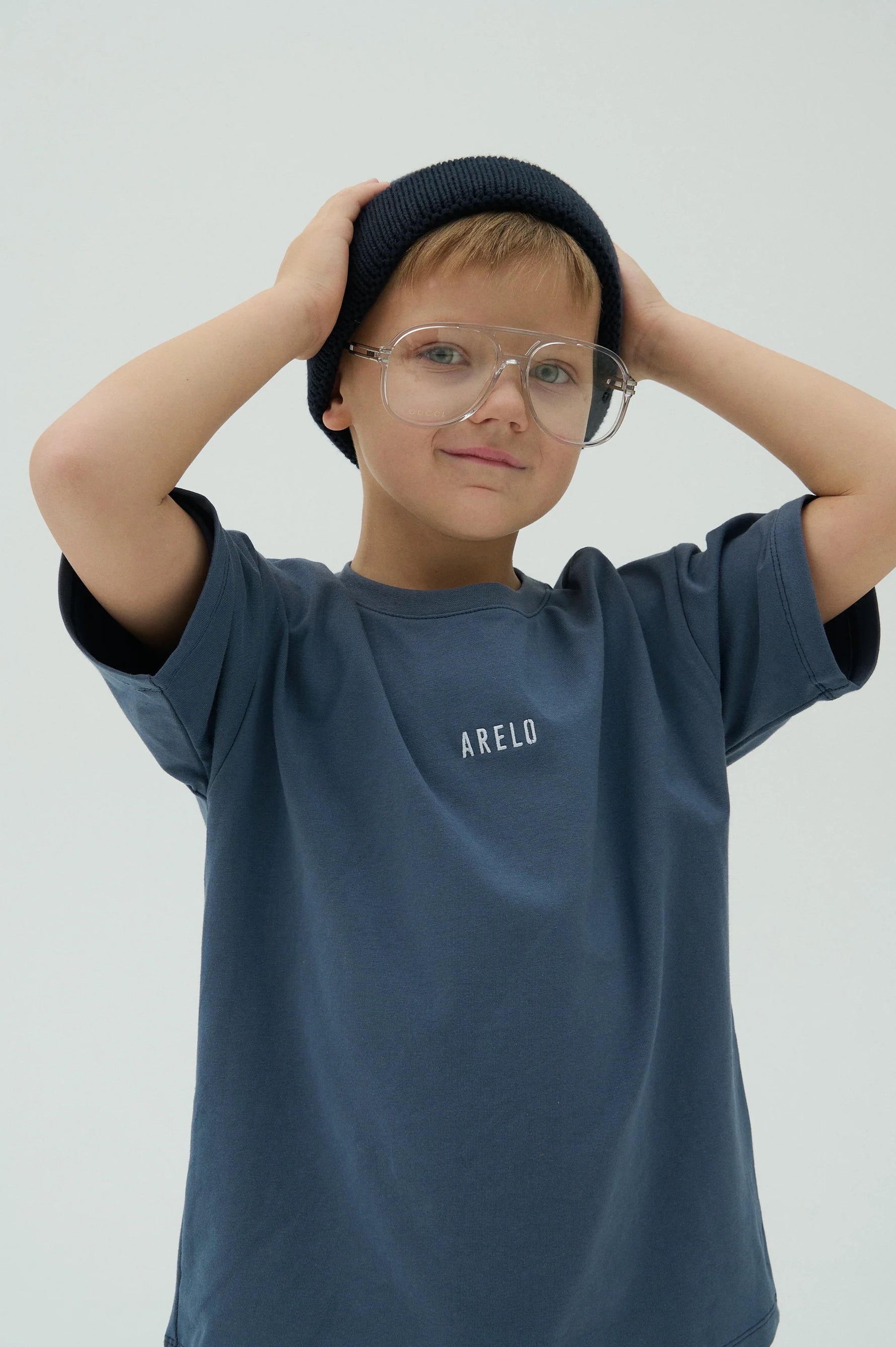 Oversized blue T-shirt from the Basic kids’ collection, made of 95% organic cotton and 5% elastane, offers softness, comfort, and a versatile, easy-to-match design. The minimalist logo in the center adds a stylish, contemporary touch.**