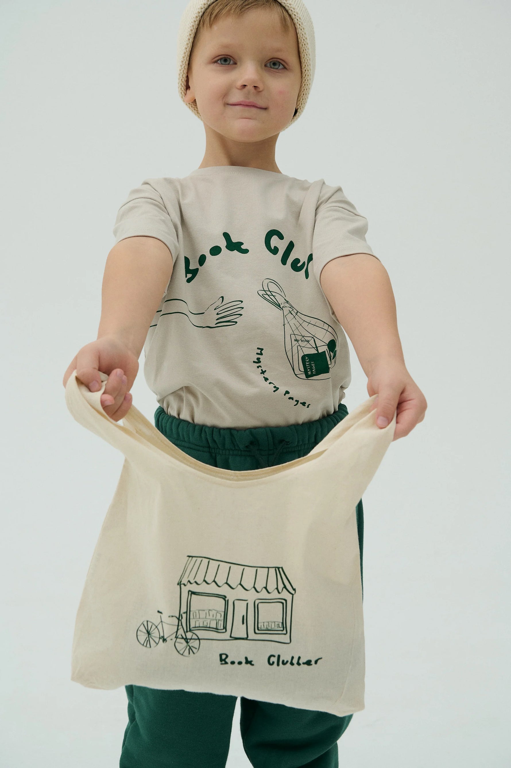 Beige T-shirt from the Book Club collection, made of 95% organic cotton and 5% elastane, combines comfort, softness, and stretch for everyday ease. This T-shirt is not only gentle on the skin but also environmentally friendly. The front features a playful bookstore illustration, inviting children to discover the joy and adventures of the world of books.