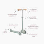 This eco-conscious material is sourced through certified waste disposal partners and repurposed from discarded items such as bottles, bags, cups, and fishing nets. Designed to grow with your child, this scooter not only promotes balance and coordination but also embodies our dedication to reducing environmental impact through thoughtful design.