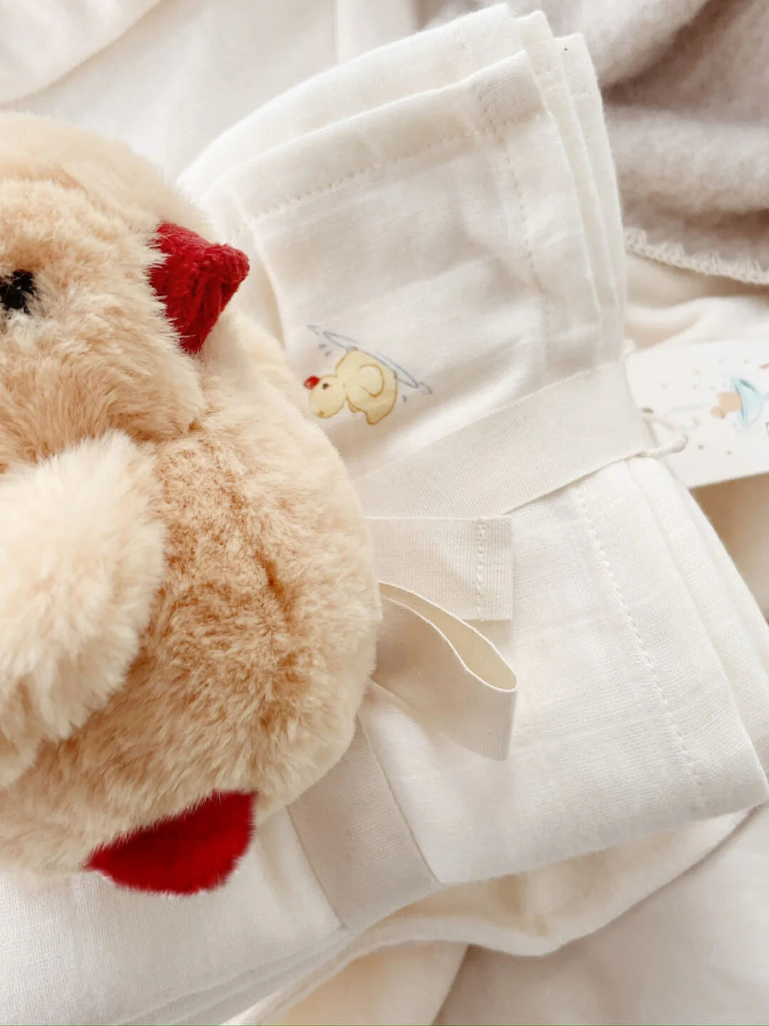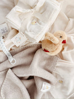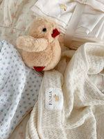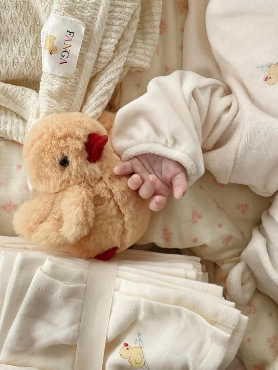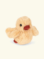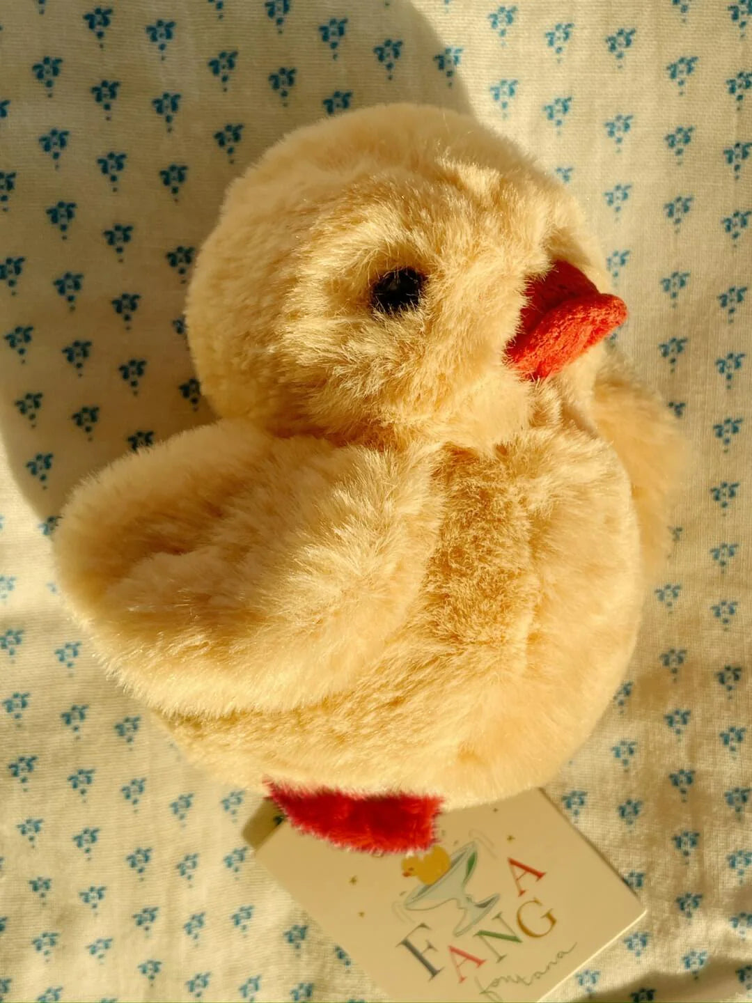 Meet Fanga: Our soft and fluffy little yellow duck that makes a comforting rattling sound when played with.